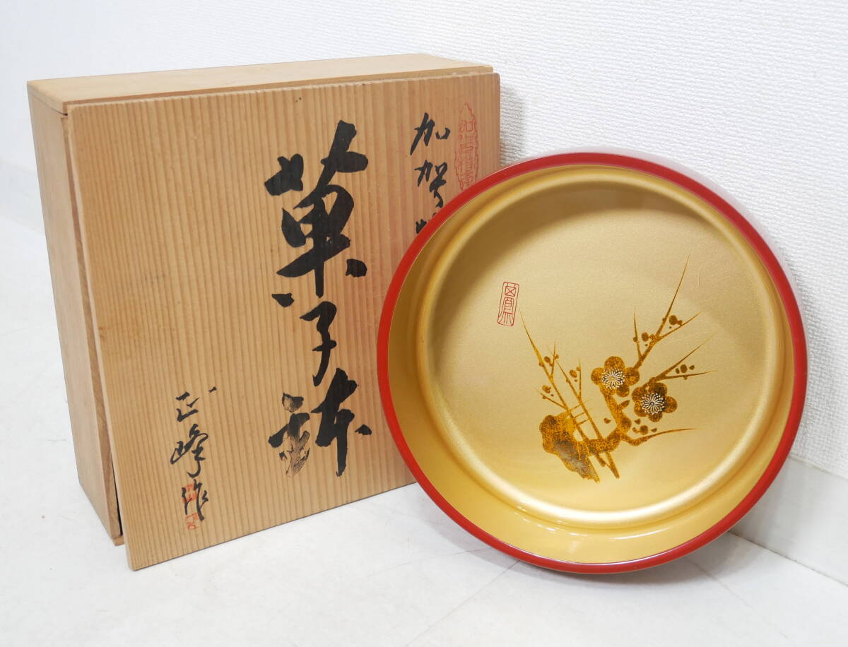 > ▲(R706-H69) 加賀特産 正峰作 菓子鉢 和菓子 朱色 和食器 菓子入れ 花文 茶道具 煎茶道具 直径約20.5cm×高さ約6cm 共箱付き