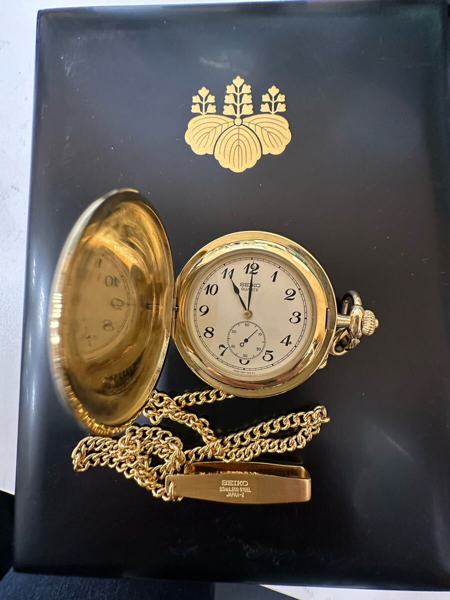 - Y06014 内閣総理大臣 SEIKO 懐中時計 7N07-001A クォーツ ゴールドカラー 会津塗箱