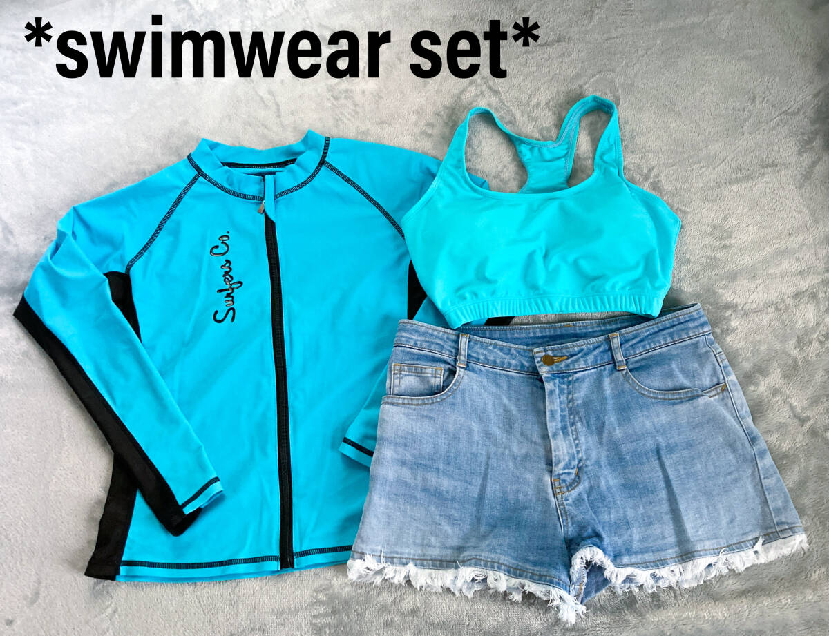 - 未使用含む レディース スイムウェア 水着 ラッシュガード 3点セット ブラカップ付き デニム ショートパンツ 水色 ブルー L