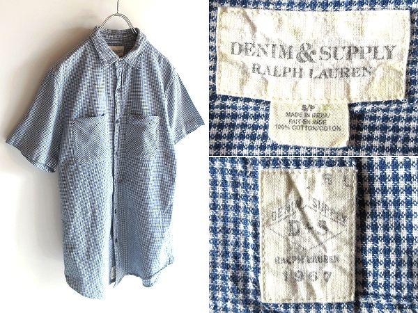 - ネコポス対応 DENIM&SUPLLY RALPH LAUREN デニム&サプライ ラルフローレン 裾ロゴワッペン コットン 半袖 チェックシャツ S ブルー 青
