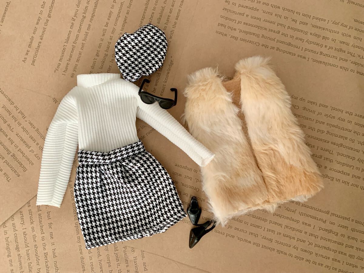 - ドール服☆5点セット☆ファーベスト&上下ウェア&帽子&サングラス&ヒール ドール用 ブライス 1/6スケール フィギュア