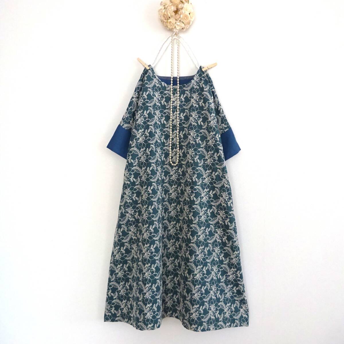 - すぐ発送◆花柄刺繍×上質リネン100%のAラインワンピース◆麻 フォグブルー 青 ハンドメイドop フリーサイズ