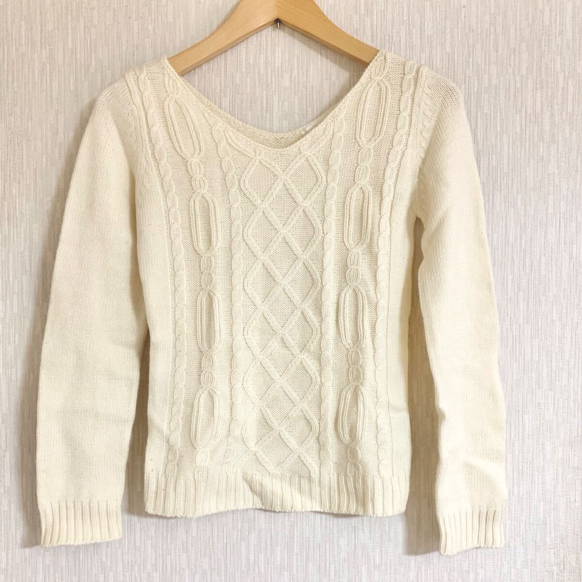 - 匿名配送 ウールアクリル カシミヤ混 Vネックセーター ケーブル柄 白 長袖ニット オフホワイト 長袖セーター M ナチュラル 秋冬 防寒