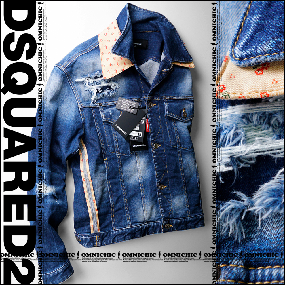 > 花柄レイヤード二枚襟■24春夏新品147,400円【DSQUARED2】ディースクエアードKABAN 伊製インディゴリペア加工ストレッチデニムジャケット44