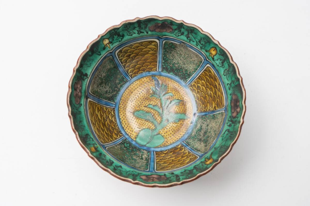 中央には柔らかなタッチで描かれた植物文が配され、周囲には鱗文様や緑釉の濃淡がリズミカルにあしらわれています。縁を彩る唐草文様や小さな花々も丁寧に描かれており、絵付けの美しさが際立つ一品です。