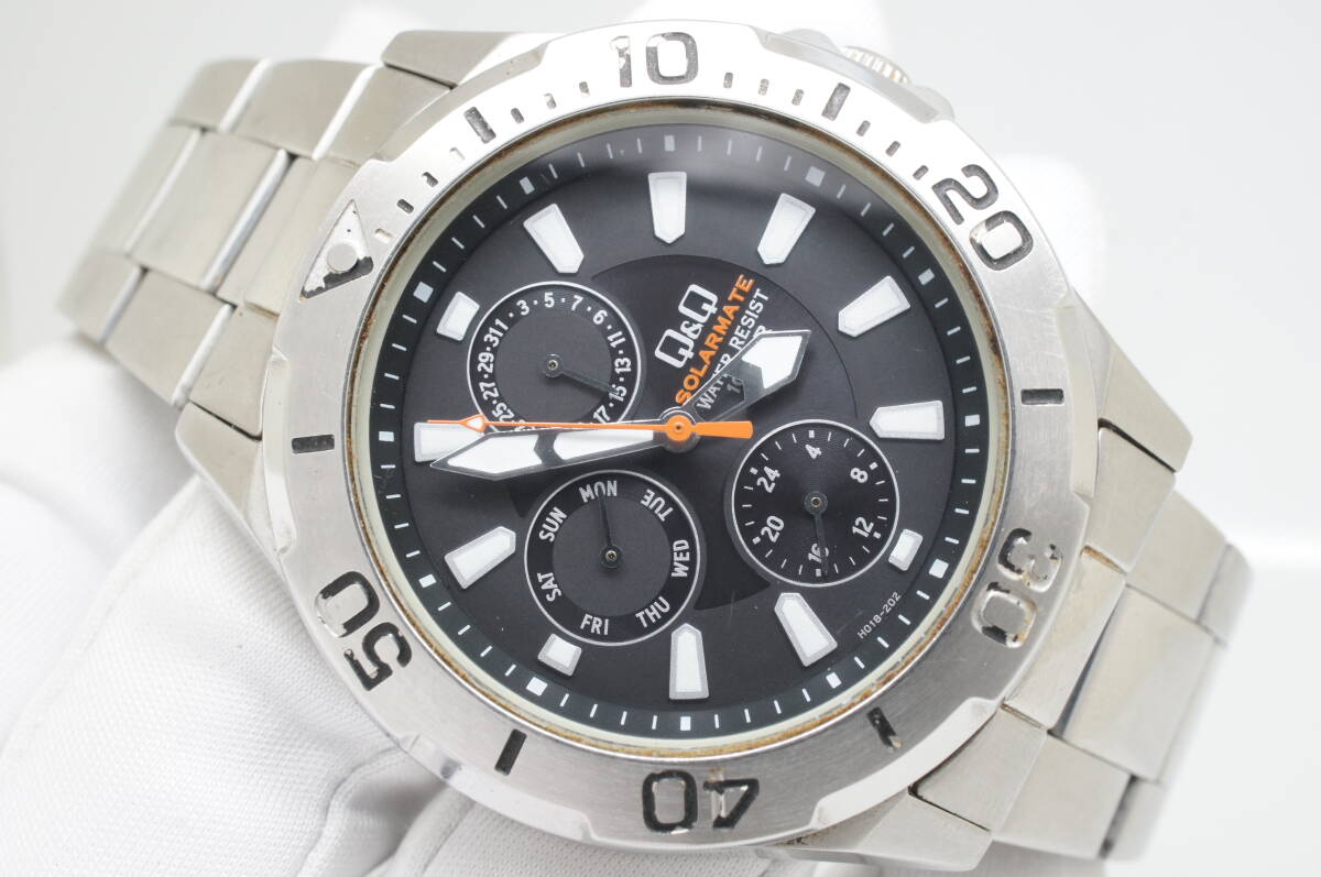 > W76●作動良好 CITIZEN シチズン Q&Q SOLARMATE ソーラー 黒文字盤 デイデイト 逆回転防止ベゼル メンズ腕時計 シルバー お洒落