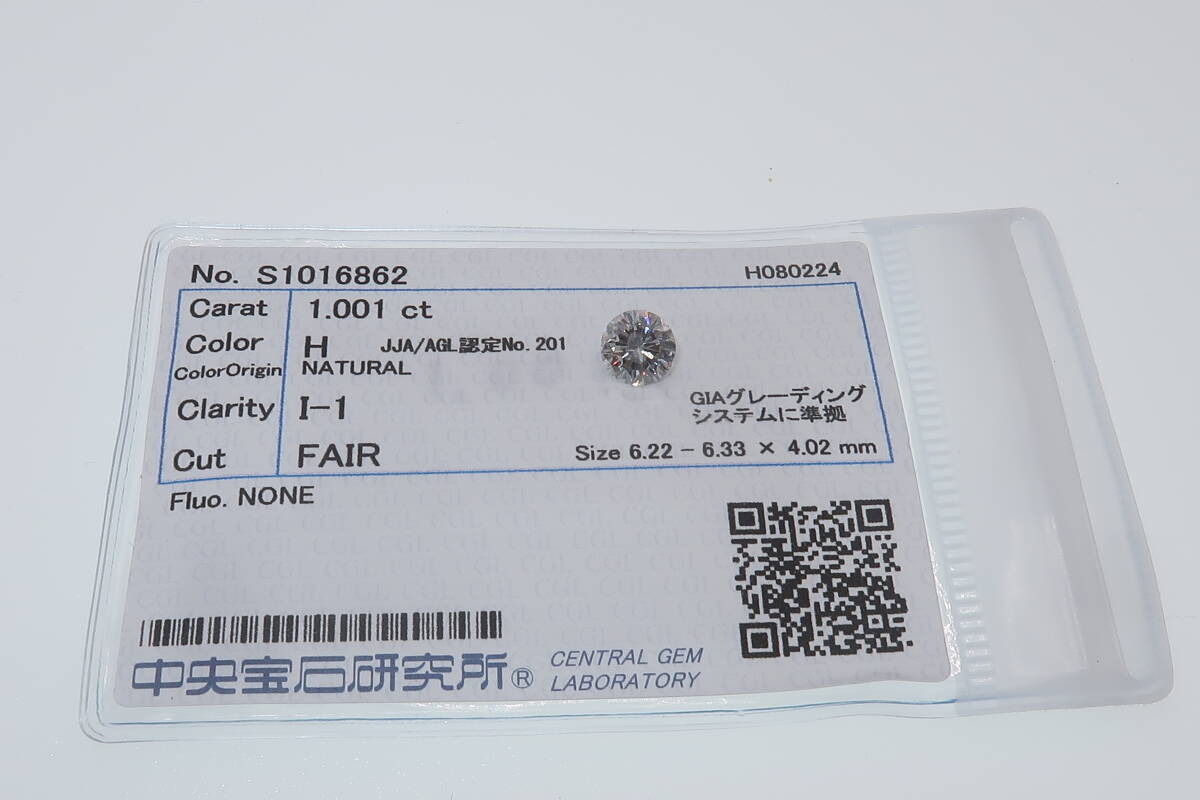 - ダイヤモンド ルース 1.001ct H/I-1/FAIR 中央宝石研究所