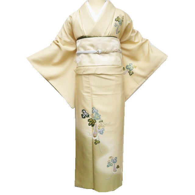 > 付下げ 付け下げ 訪問着 着物 中古 袷 へちまの図 福叶う 淡黄色 多色 金 身丈159.5cm 裄66.5cm M きもの北條 A1201-9