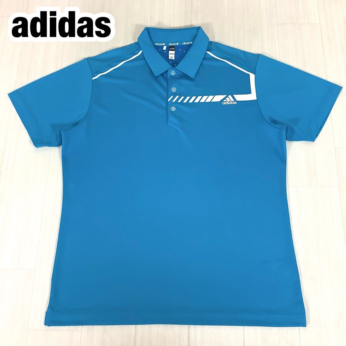 - 美品 adidas アディダス 半袖ポロシャツ ゴルフウェア サイズO アクアブルー プリントロゴ 速乾 クライマクール