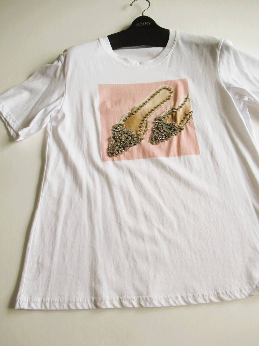 - レディース クルーネック ラインストーン付きヒール ストレッチ 半袖Tシャツ 特価セール シロ t3