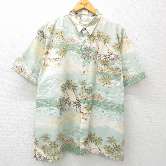 - XL/古着 半袖 ハワイアン シャツ メンズ 90s ヤシの木 海 大きいサイズ 薄緑系 グリーン 25jun10 中古 アロハ トップス