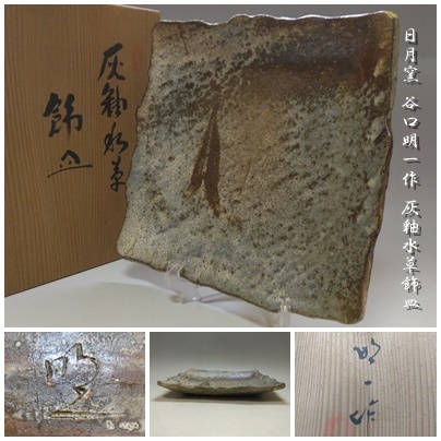 - 【T-427】日月窯 谷口明一作 灰釉水草 飾皿 共箱付 茶道具