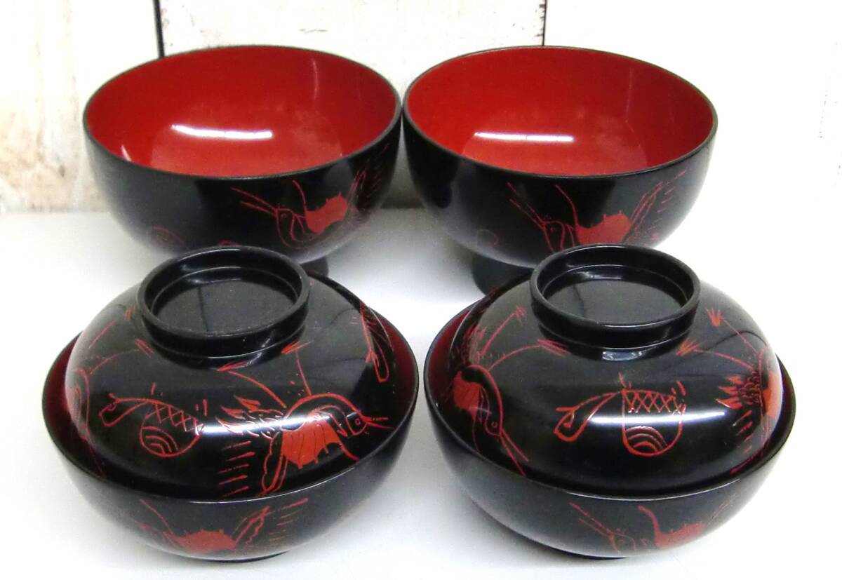 - *伝統工芸 工芸品 工芸美術 *越前漆器 *お椀 汁椀 吸物椀 *4点まとめ セット 4客 *黒内朱 鶴亀模様 木製 漆塗 *元箱付き