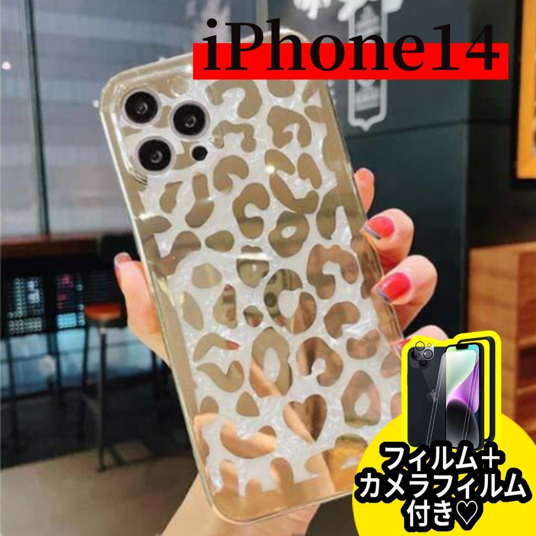 > iPhone14★シェルミラー レオパード柄 アイフォン スマホケース ゴールド ヒョウ柄 おしゃれ 韓国 ゴールド 派手 ガラス フィルム セット
