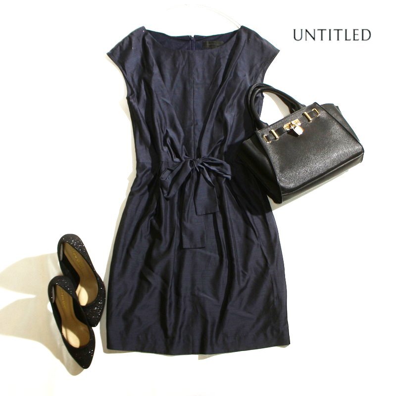 > 美品 アンタイトル UNTITLED 株) ワールド 夏 艶 フォーマル オーガンジー 半袖 ワンピース 9号 2 ネイビー 紺 ミセス 綺麗め ワンピース