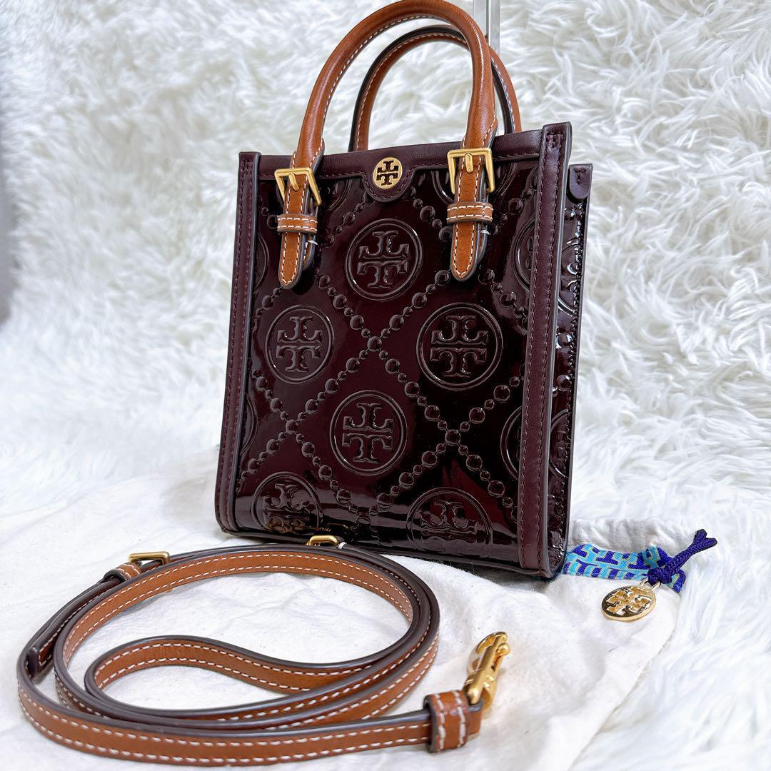 - 極美品 TORY BURCH トリーバーチ Tモノグラム レザー ミニトート バッグ 2way ハンド モノグラム型押し ボルドー レザー ショルダー