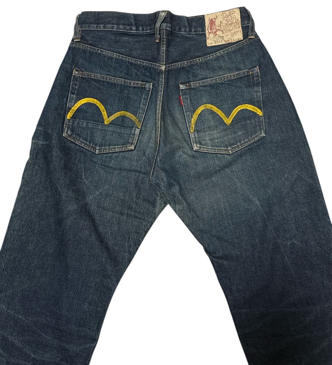 - 初期水牛リネンパッチ ▲ U無し EVIS エヴィス ▲ LOT 501XX 2501 黄色カモメ レッドセルビッチ ストレート デニム33×35