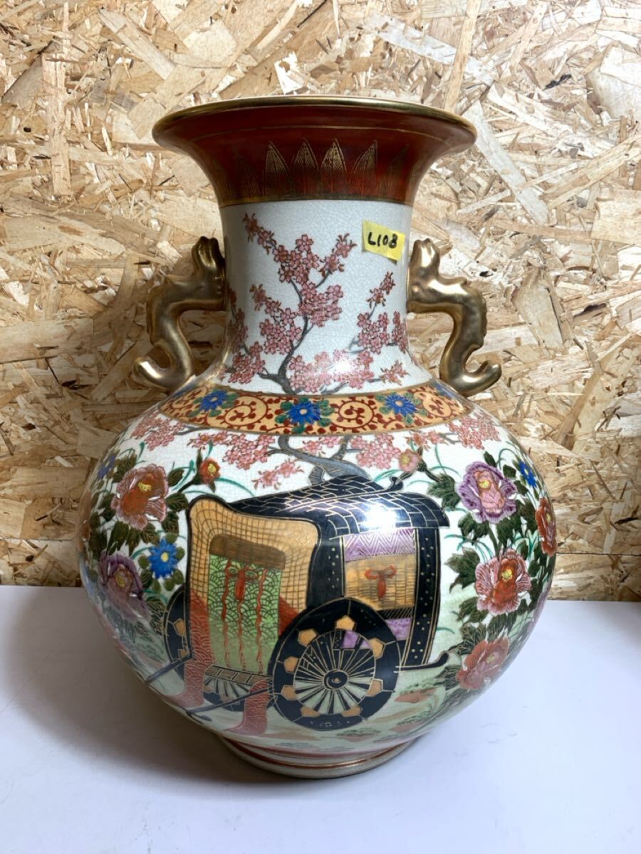 - 薩摩焼 丸十字家紋 金彩 色絵 御所 車山水 楼閣 風景 図双 耳付 大花瓶 飾壺 壷 細密絵付 骨董品 高さ49cm 花瓶 花器 壺 花入 刻印有 L108