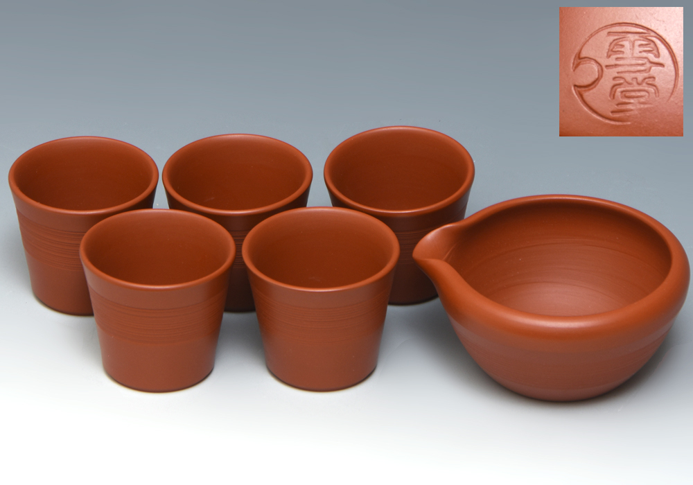 - 轆轤師 吉川雪堂 常滑(造)朱泥 煎茶器 湯さまし 煎茶碗5客 茶杯 煎茶道具 茶道具 陶磁器 u0401o