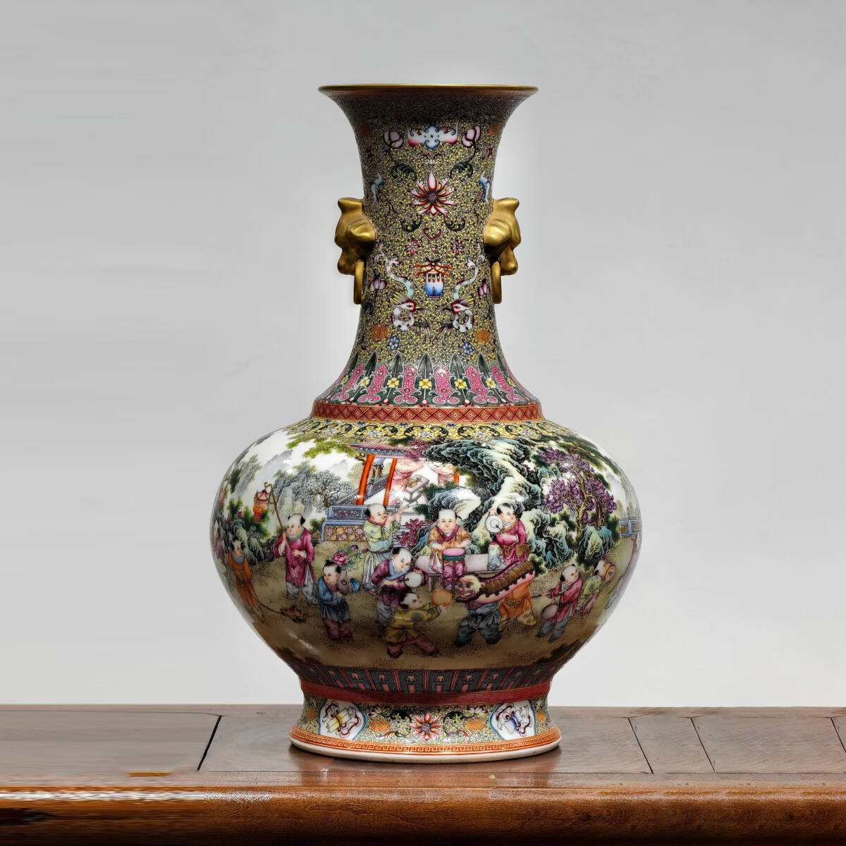 - TM6#3010【3.1】中国骨董 人間国宝 磁器【【大清乾隆制】粉彩通景嬰戯人物紋蒔絵獣耳尊瓶】工芸品 施釉陶 青花磁 陶芸 精美彫 置物 收藏品