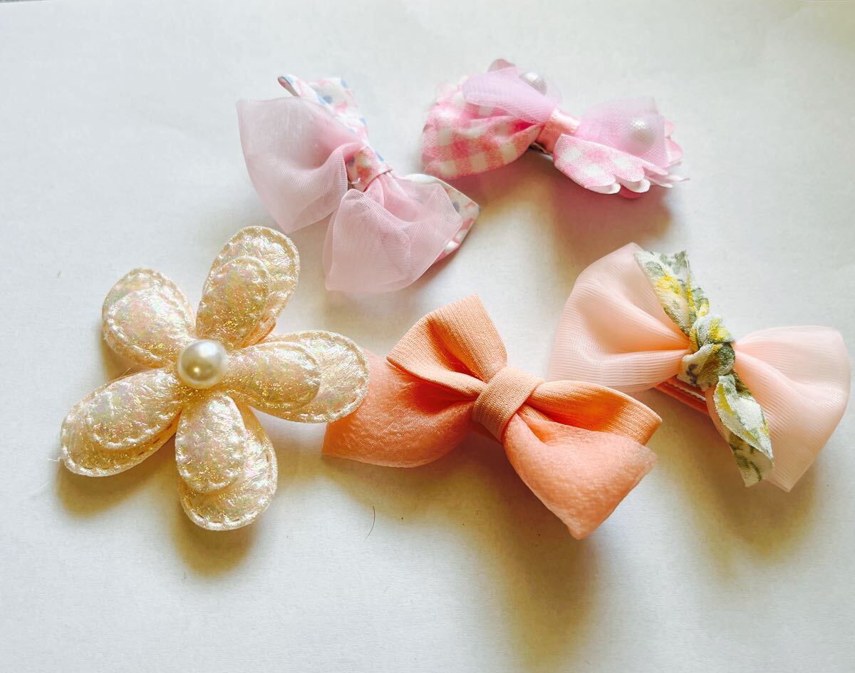 - 可愛いヘアクリップ☆ヘアピン 5点set♪ピンク&オレンジ① リボンモチーフ 布リボン ストライプオーガンジー 髪飾り