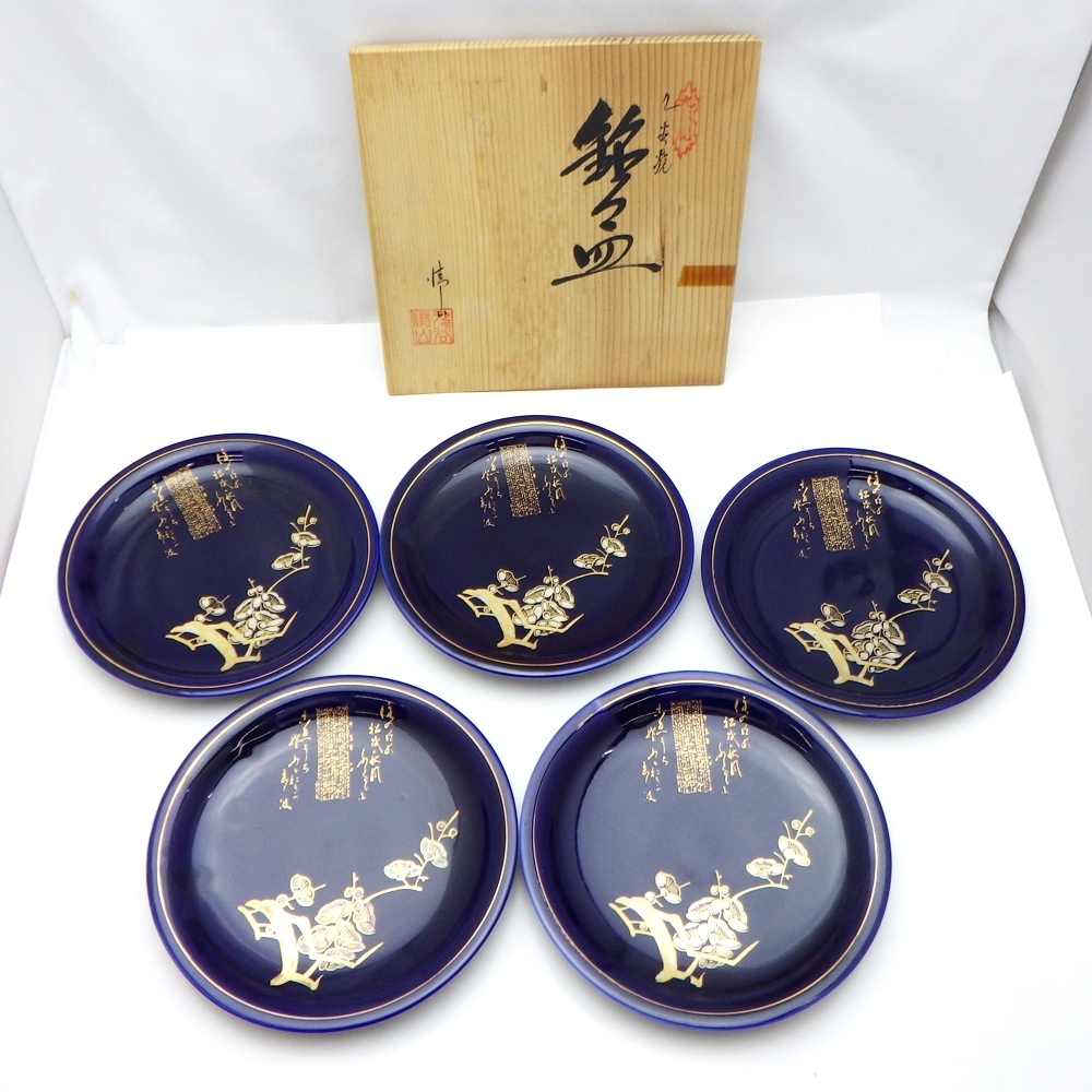 > 25-H-161 九谷焼 清山 銘々皿 5枚セット 丸皿 取り皿 直径15cm 細字 金彩 木箱つき 伝統工芸品 保管品