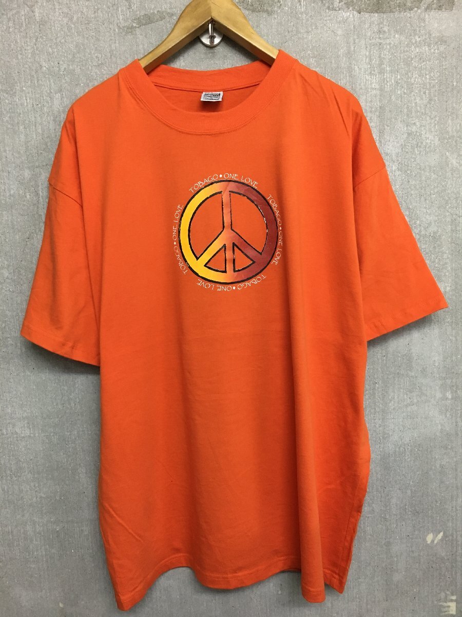 > ◆アメリカ USA 古着 XL TOBAGO ONE BORE ZOOM Caribbean ピースロゴ マークプリント Tシャツ オレンジ サイズXL