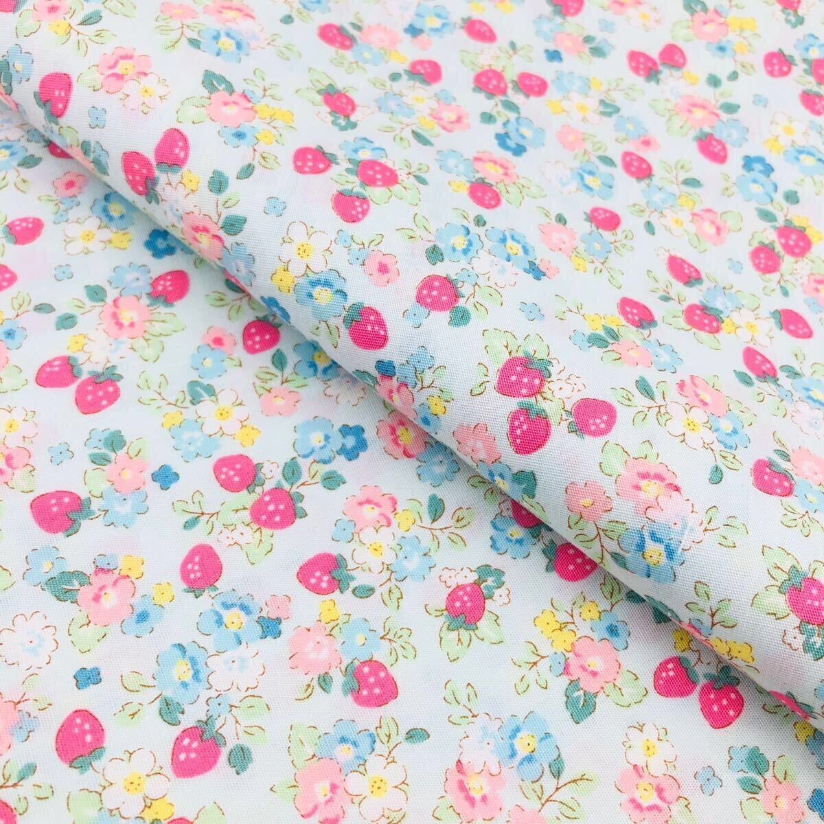 > 50cm いちご ブロード 可愛いいちご 生地 花柄 フルーツ柄 はぎれ 108×50 綿生地 コットン 水色