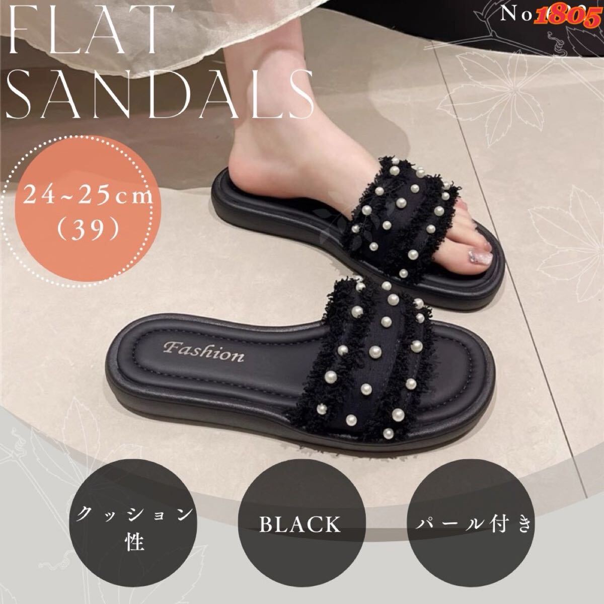 - パール付き フラットサンダル ブラック 24〜25㎝ フリンジ ぺたんこ 韓国