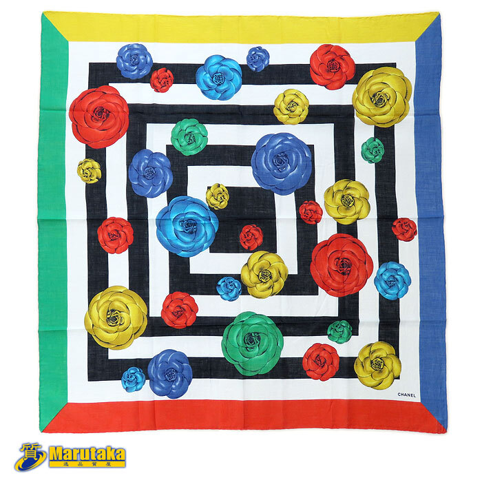 > 【シャネル】カメリア柄 スカーフ 綿100% コットン 約85cm×85cm カラフル おしゃれ ブランド小物 CHANEL 中古 66-0204
