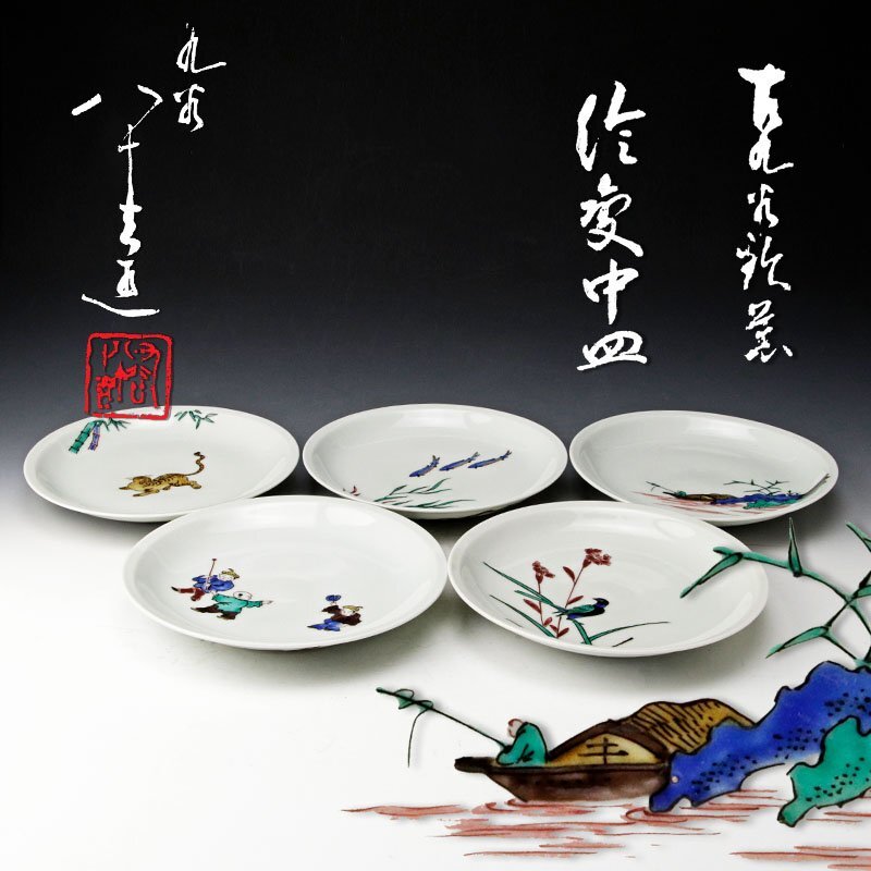 - ★【古美味】初代徳田八十吉 古九谷欽慕 絵変中皿 五客 茶道具 保証品 p7NK
