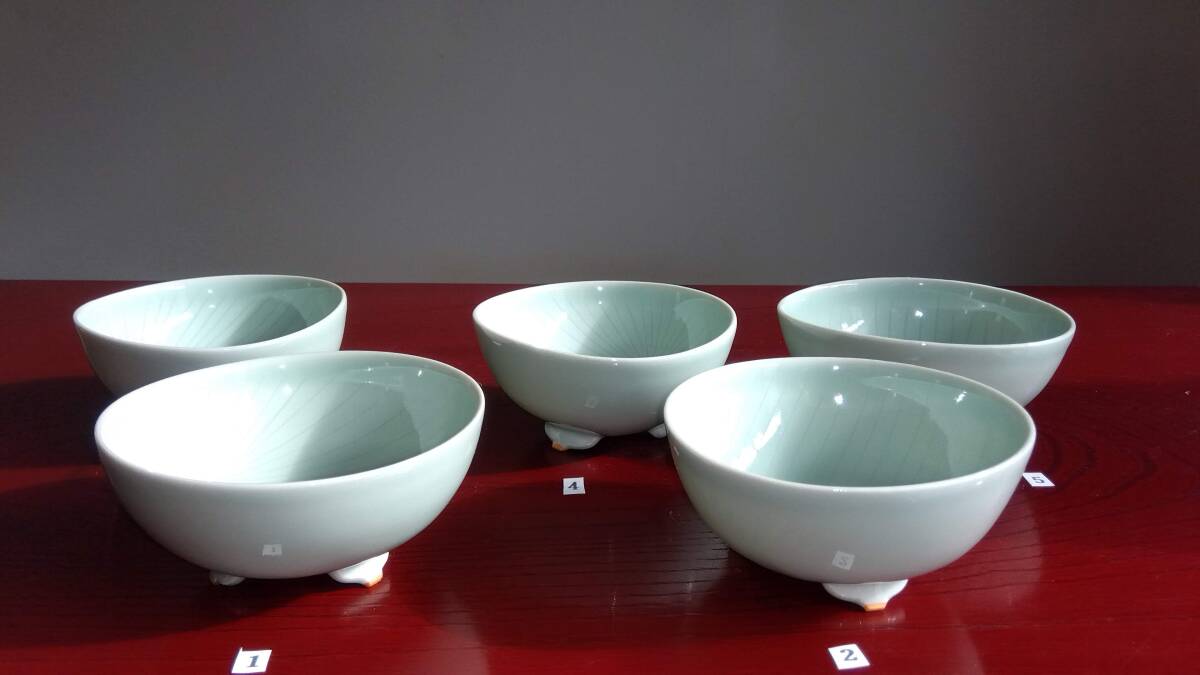 - 加賀九谷焼名工 池島保雄 青磁草花線刻模様彫向付け小鉢5客セット