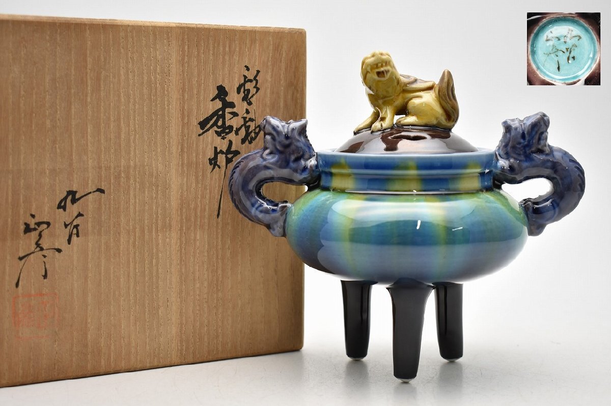 - 竜V847◆人間国宝 九谷焼 徳田正彦 三代 徳田八十吉 彩釉 獅子香炉 共箱 茶道具 煎茶道具 香道具