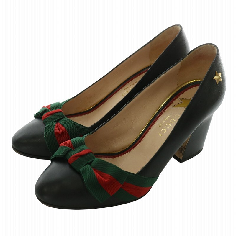 > グッチ GUCCI パンプス レザー ラウンドトゥ チャンキーヒール シェリーライン リボン 星 スター スタッズ 35 22cm 黒 ブラック