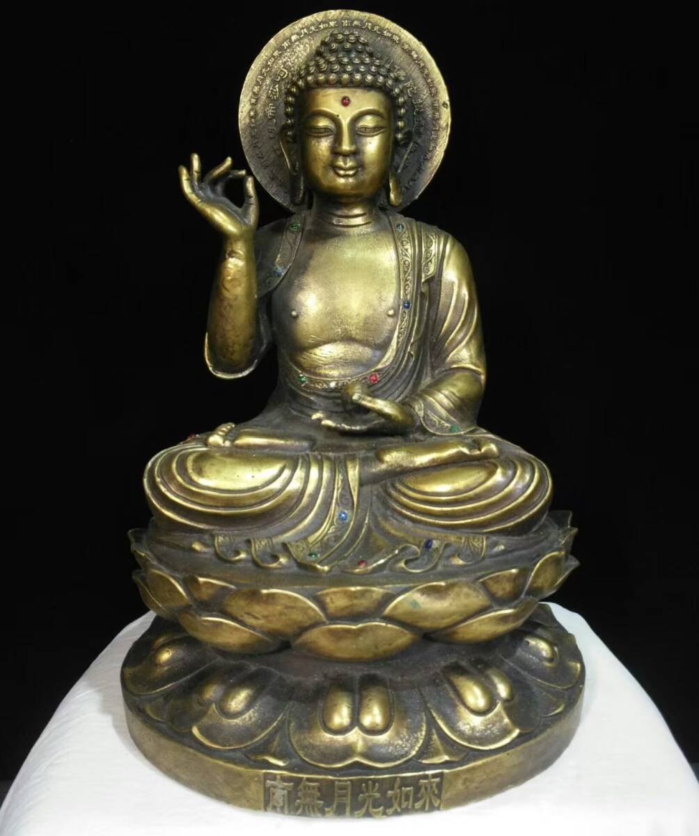 > 仏像 清代 旧蔵 銅モザイク宝石『南無月光如来』 チベット古寺 銅製 銅琉金 唐物 收蔵品 時代物 古美術 古置物 供養品 文房具 仏教6.26