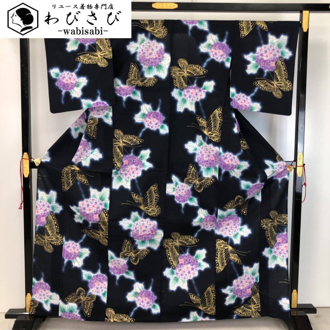 青褐色のお色味に蝶々に紫陽花の柄裄がデザインされた素敵なお品でございます。