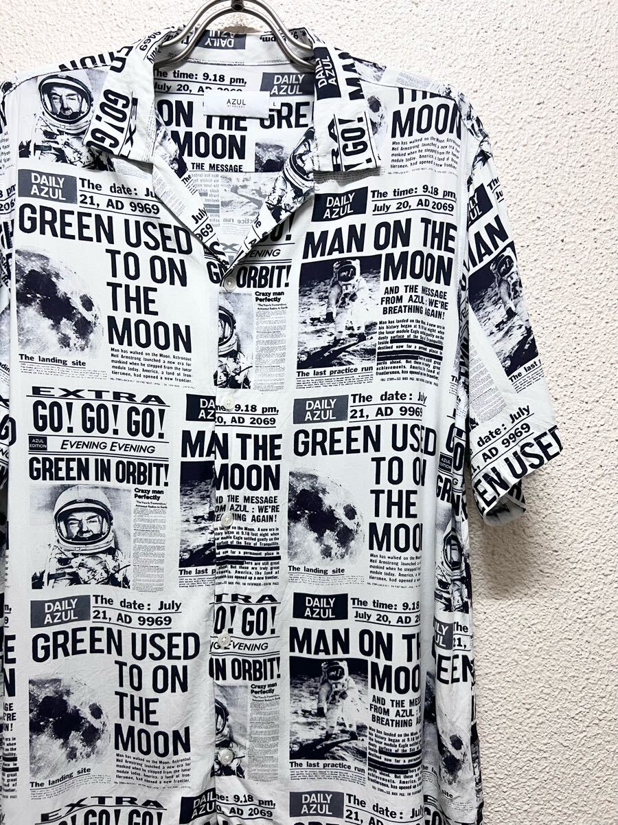 - AZUL by moussy マウジー ニューズペーパー柄 レーヨン オープンカラー シャツ アロハシャツ