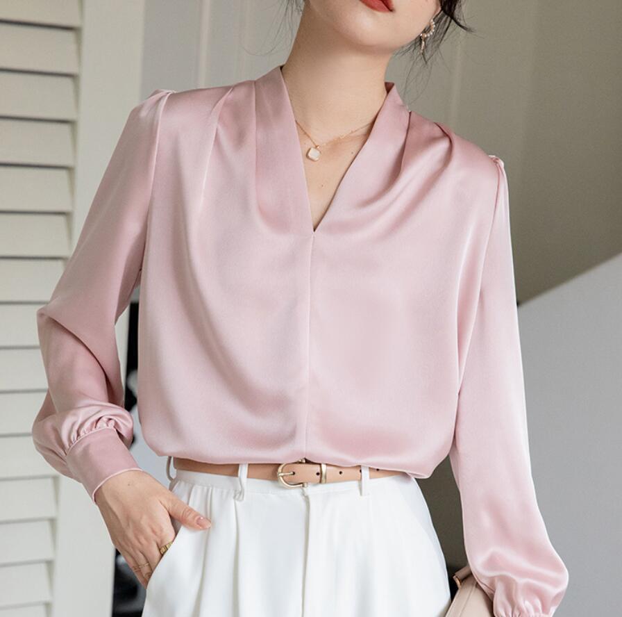 - 春夏新作 /エレガント つるつる サテン ブラウス Vネック 長袖 ブラウス 30代 40代 50代 通勤 OL 着痩せ オシャレ トップス/ピンク