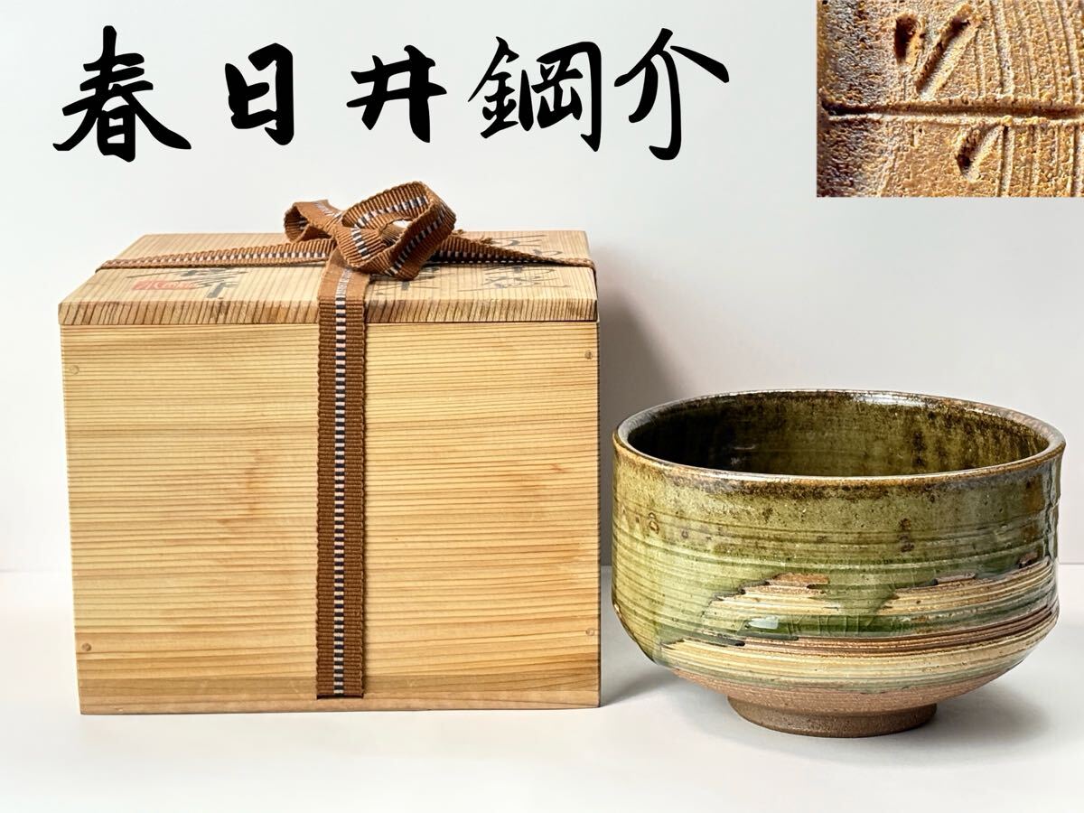 - C2593 小原窯【春日井 鋼介】作 灰釉茶碗 勅題『木』共箱共布