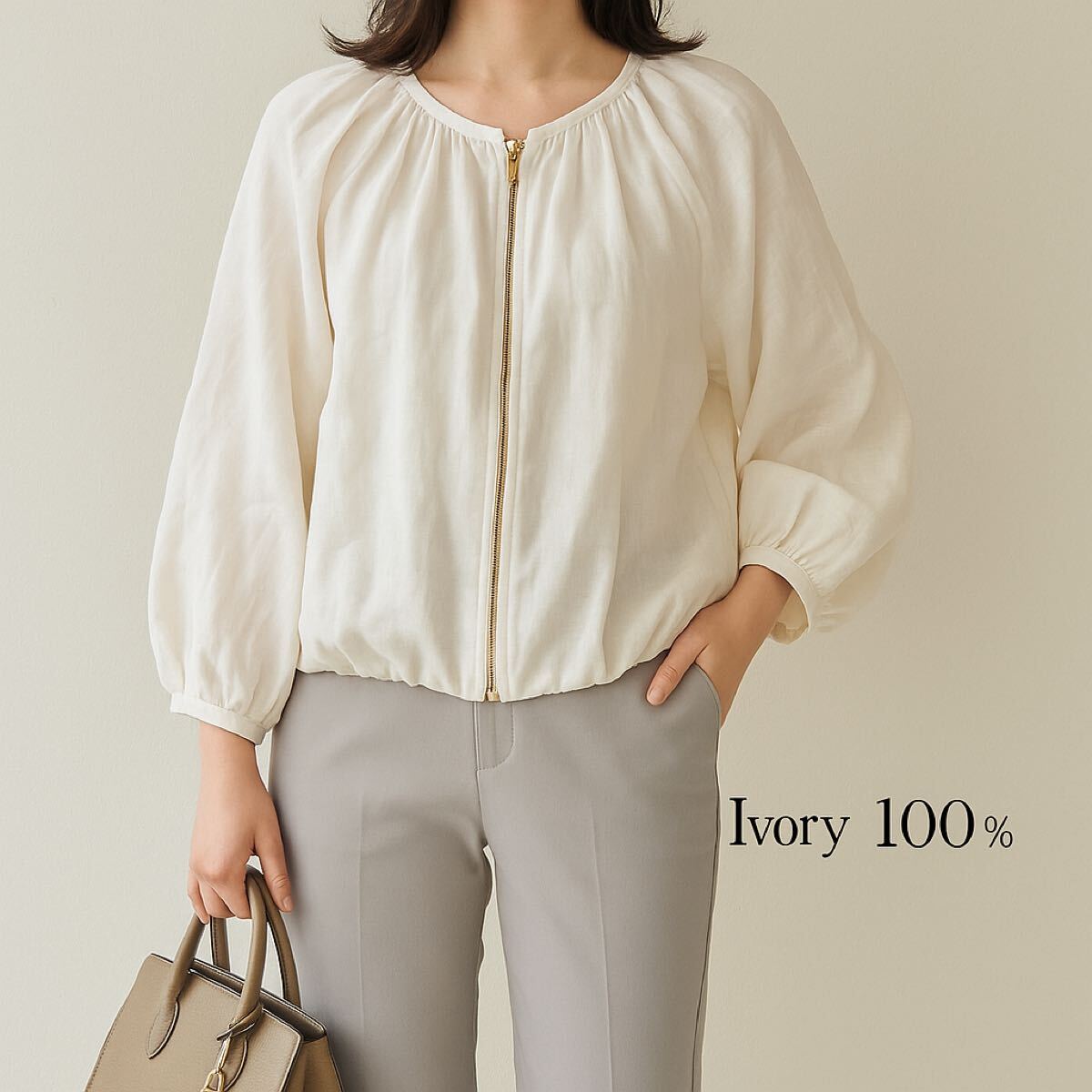 - 新品タグ付 ストロベリーフィールズ 麻100% ジップアップブラウス ホワイト 春夏 大人可愛い