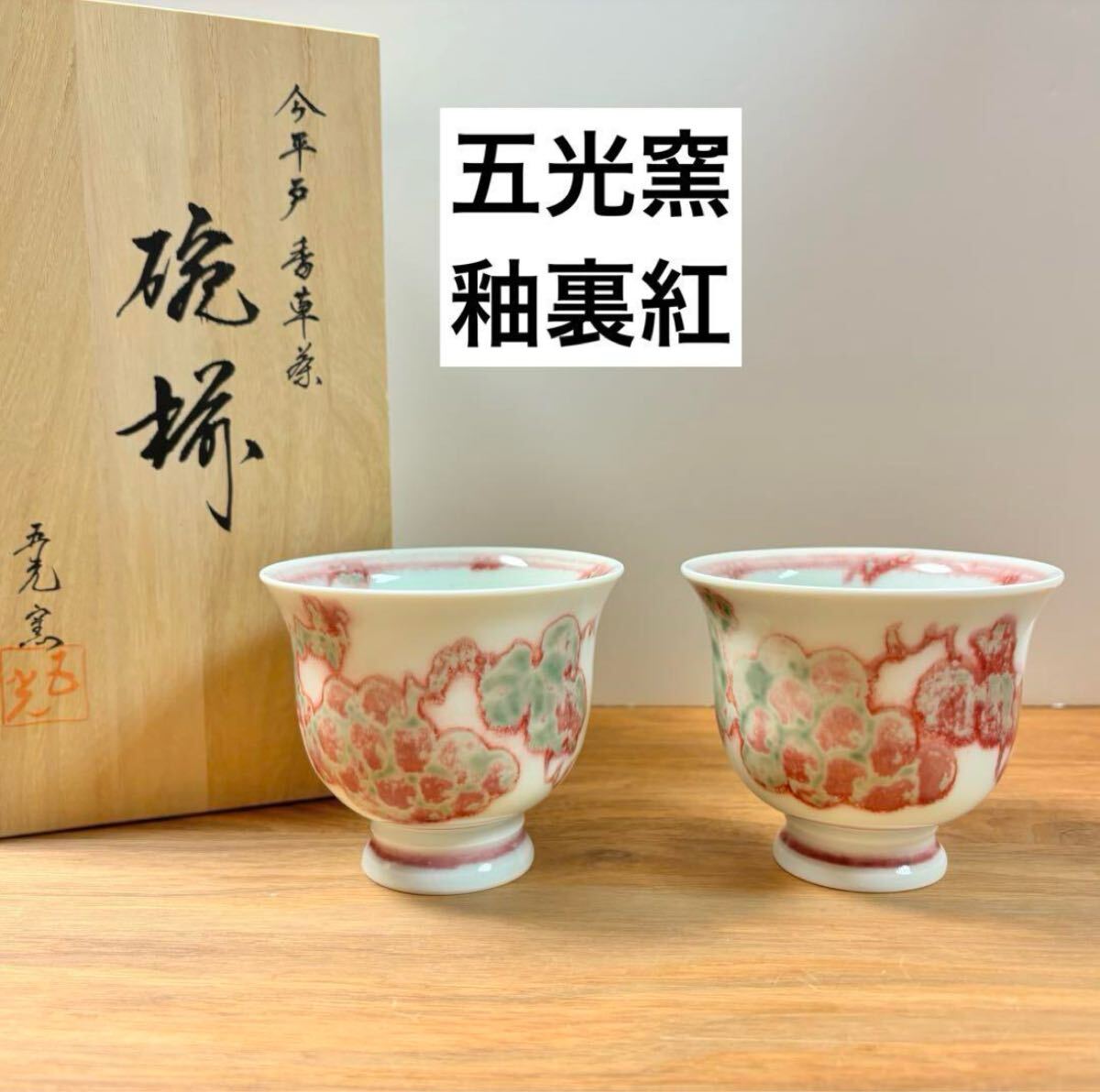 - 未使用◇五光窯◇釉裏紅◇ブドウ紋 湯呑み 2客セット◇藤本岳英◇
