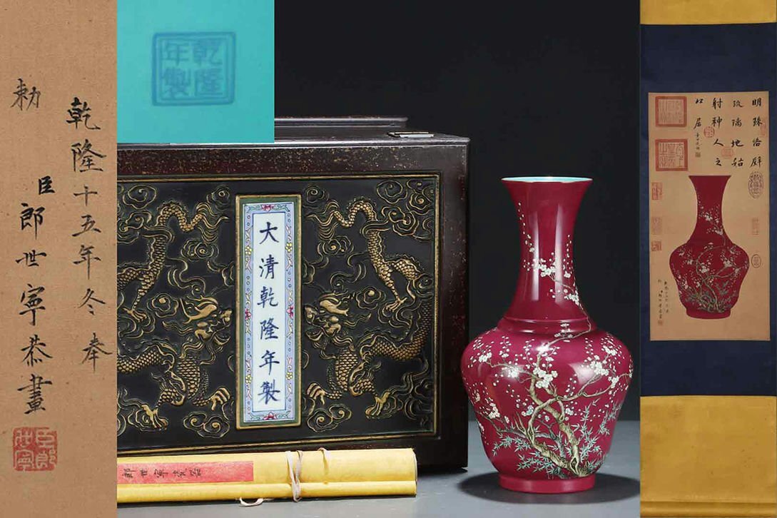 > ▼渡鶴羽▼A4586清乾隆年製 紅釉粉彩花卉描金賞瓶・古陶磁器 ・珍品旧蔵・古賞物・時代物『中国古画 郎世寧 絹本立軸 肉筆保証 』