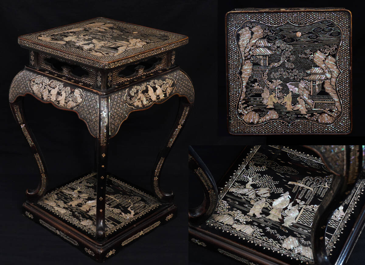 - 時代物 楼閣山水人物図 螺鈿香炉台 螺鈿花台★27.8×40.5cm 状態良好