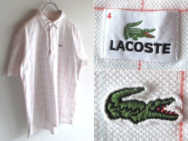 - ネコポス対応 LACOSTE ラコステ KH007S ワニロゴワッペン グラフチェック 鹿の子 半袖 BDポロシャツ 4 白 ホワイト オレンジ ライトブルー