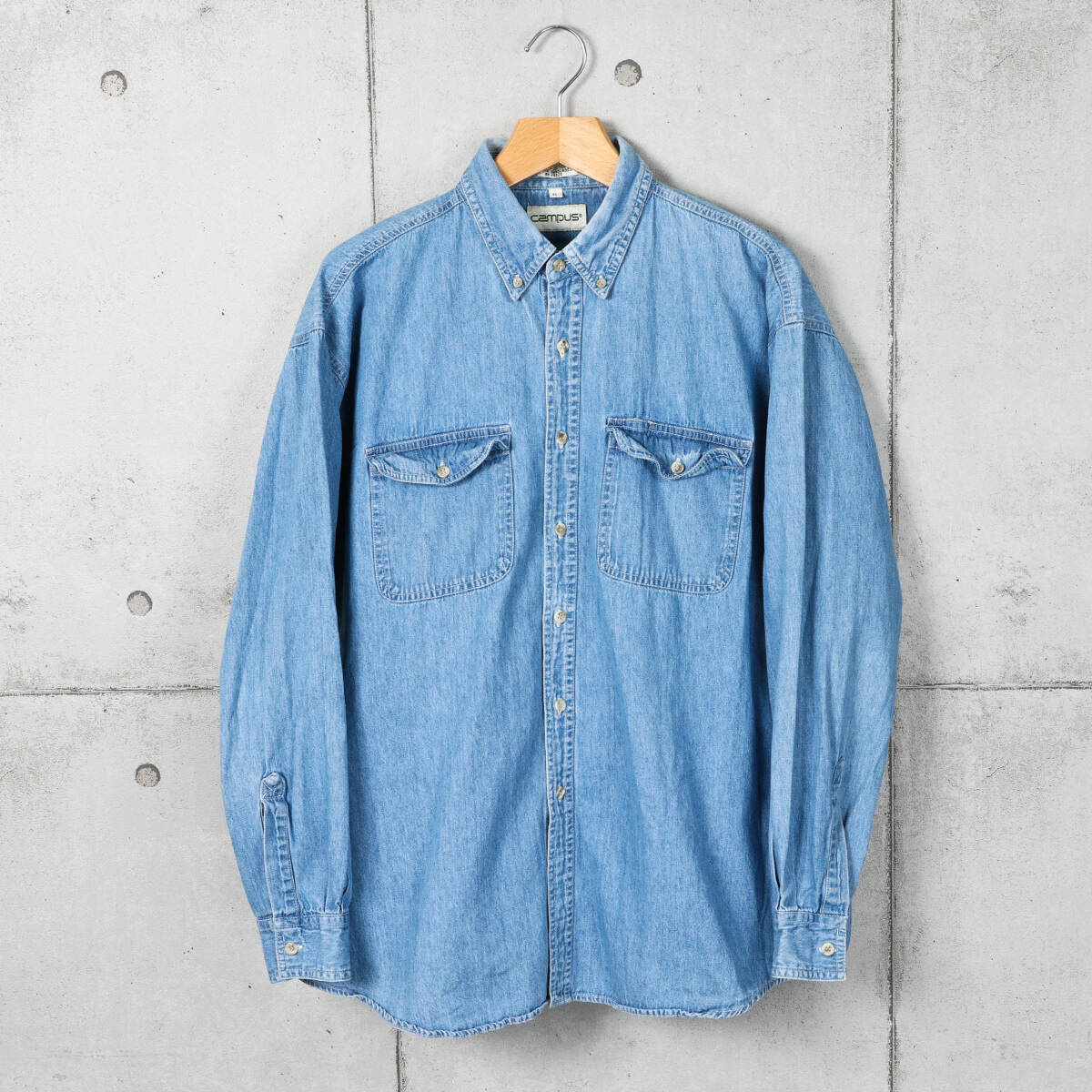 - Campusキャンパス◆デニム素材 ワーク ボタンダウンシャツ◆ブルー◆サイズXL