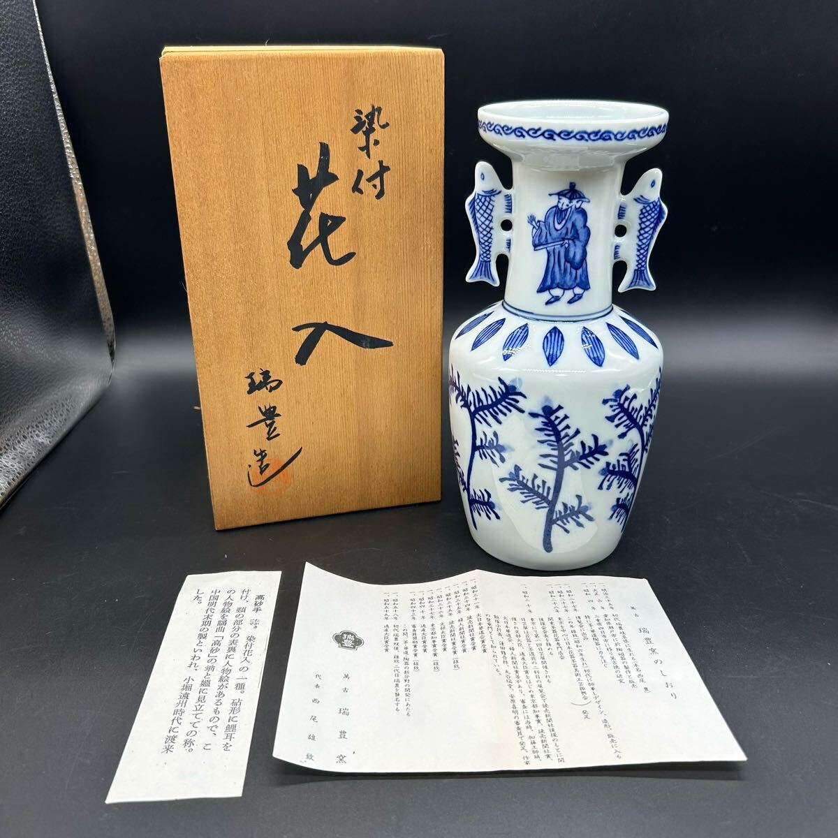 - 万古焼 西尾雄致 瑞豊 高砂 鯉魚型耳付き 染付唐人 染付高砂手花入 花瓶 花器 花入 陶器 ユ1