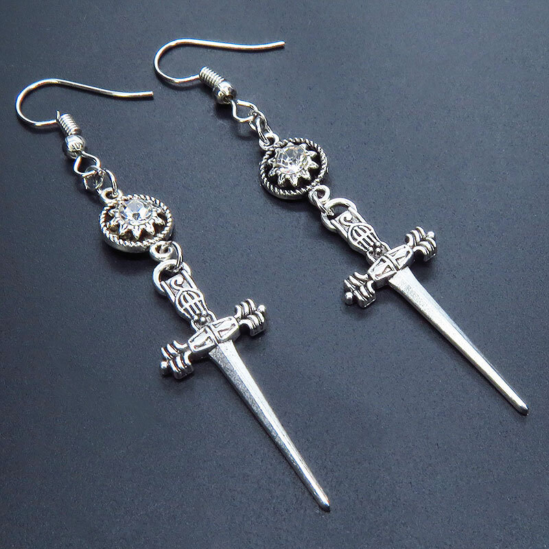 - アンティークシルバー ゴシック調ソード(剣)とラインストーンのスリムなピアス サージカル可