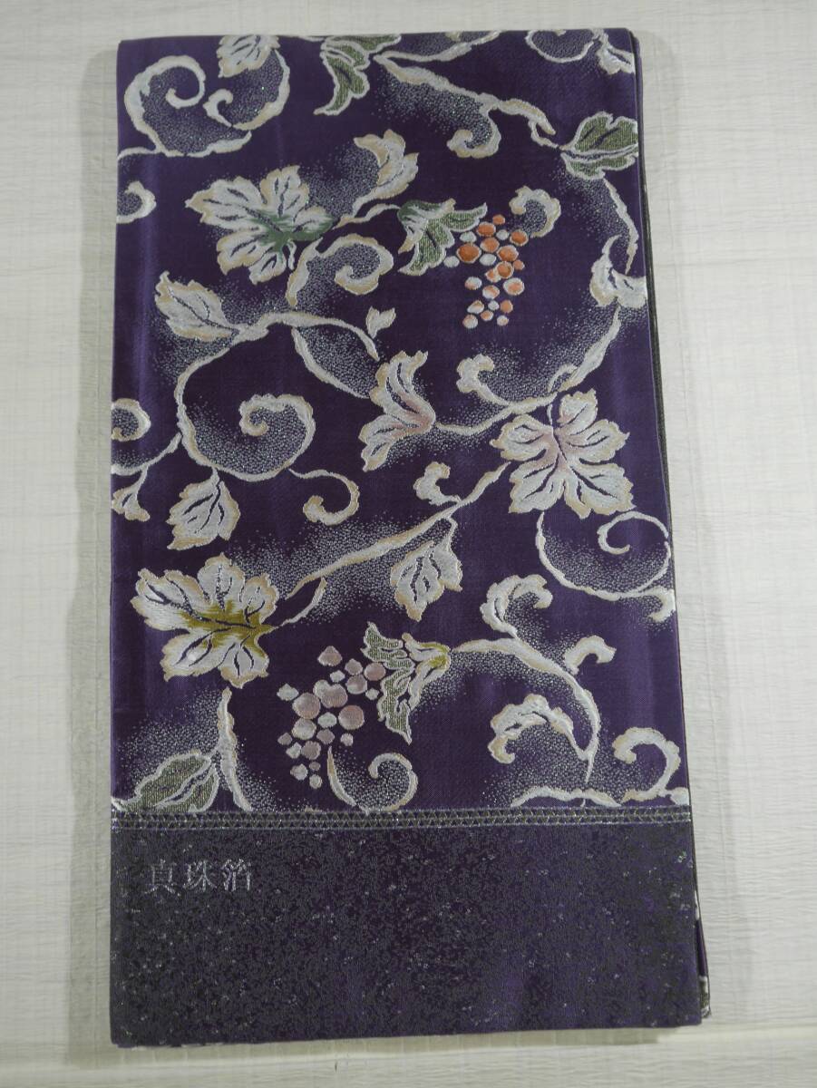 - 未仕立て新品 西陣織最高級袋帯 浅山織物 真珠箔 蔦ブドウ 古代紫地色 六通総柄 正絹85% お仕立て代込み 送料無料