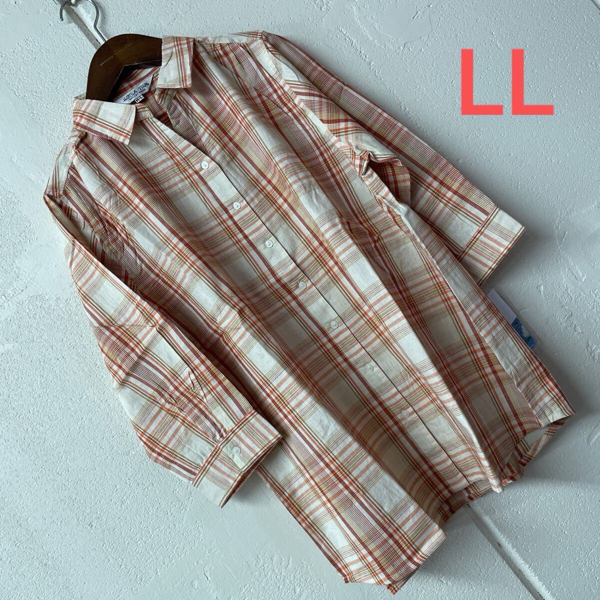 - LLサイズ綿100%七分袖ブラウス格子柄オレンジ