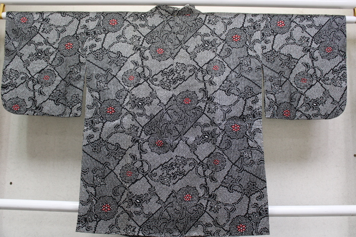 - きもの今昔8724 おしゃれコート 道中着 合繊素材 メーカー仕立て既製品 黒地に鹿の子の唐花柄